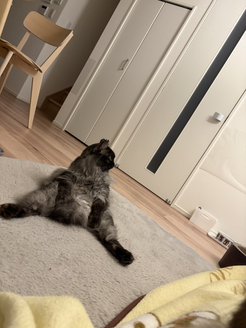 おっさんかい!!! この座り方が定番のレオンくん(目先のテレビ視聴中)